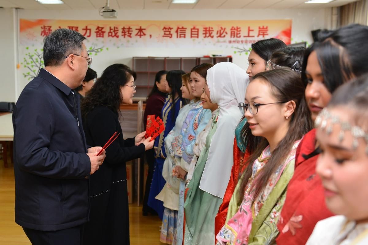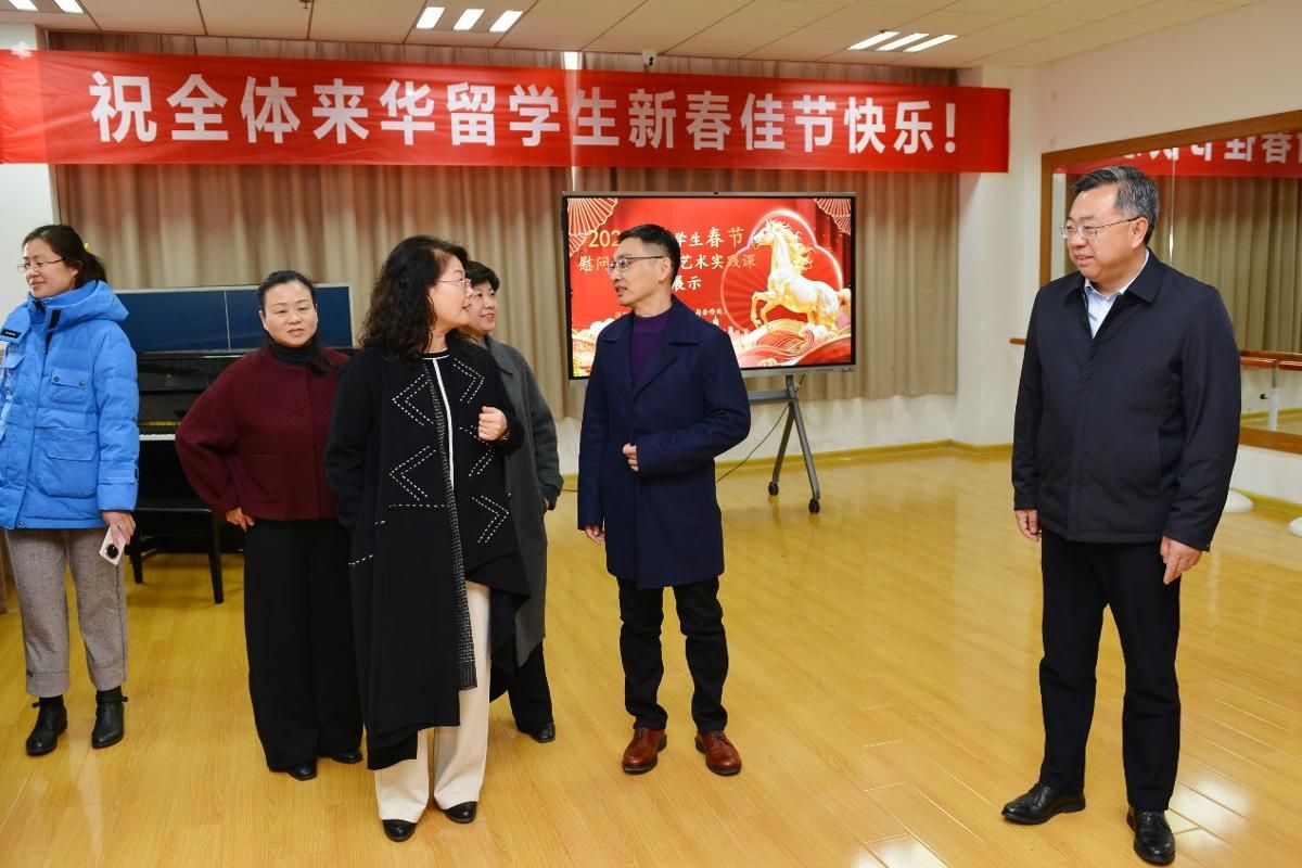 2月16日上午,我校在洞山校区大学生活动中心举办留学生春节慰问团拜会暨艺术实践课汇报展示活动。校党委书记崔成前,党委副书记曹利群出席活动,学生工作处、教务处、安全保卫处、后勤处及国际教育学院负责同志与全体留学生共迎新春。
