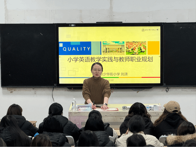讲座中,刘潇老师以“小学英语教学实践与教师职业规划”为核心展开分享。结合自身获评江苏省小学英语优质课一等奖、徐州市带头优师等成长经历,她从小学英语课堂的教学设计、课堂互动技巧、学情把握等实操层面,拆解了“真课堂”的打造要点;同时针对师范生的职业发展,从专业能力提升、职业心态培养、教科研能力积累等方面给出具体建议,鼓励同学们以扎实的专业基础和积极的职业态度,完成从“准老师”到合格教师的蜕变。刘老师的分享案例鲜活、干货满满,现场不时响起热烈掌声。