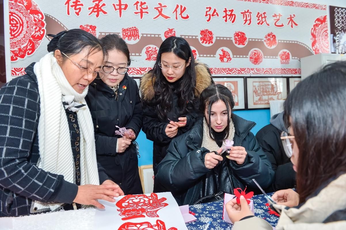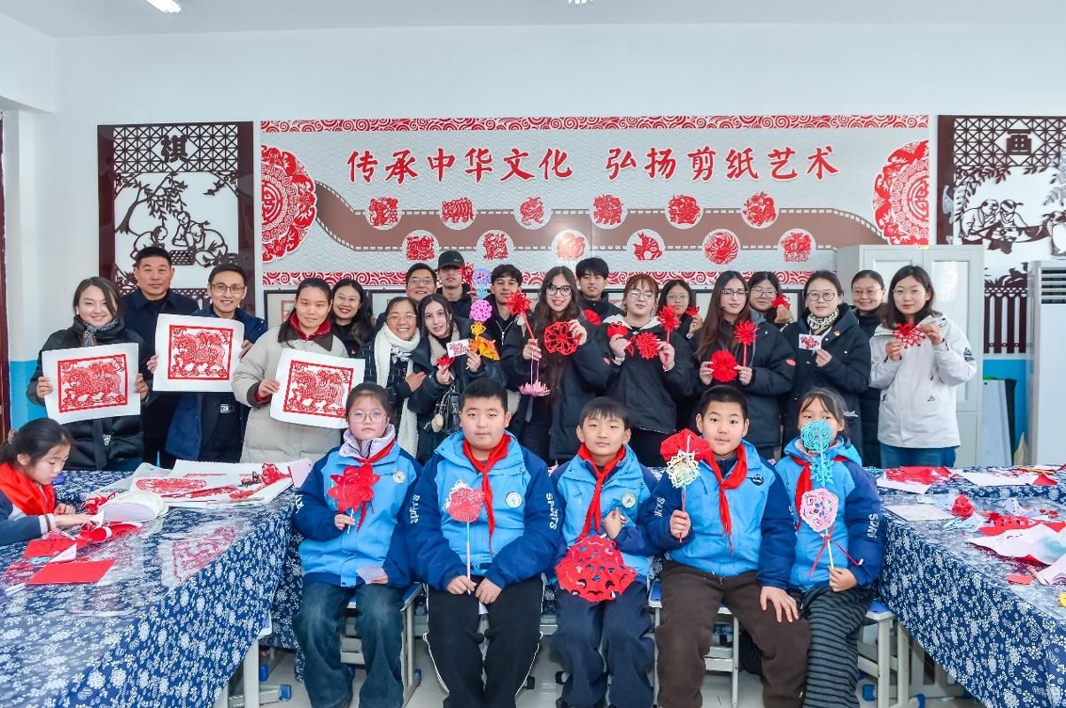 活动于9时正式启动,双方在学校会议室举行欢迎仪式。邳州市英华路实验学校校长宋端凯详细介绍了学校办学特色、党建工作成果及非遗文化教育开展情况,我院院长、党支部书记花萌教授致辞时强调了活动在党建共建、文化传播与实践育人中的重要价值,表达了深化合作的诚挚意愿。随后,党建交流环节,双方负责人围绕党建品牌创建、党员队伍建设、党建与教育教学融合等议题深入研讨,我院一行还参观了该校党建活动室与红色宣传阵地,交换党建工作材料,汲取宝贵经验;送教实践中,23级小学英语教育(中外合作办学)班李佳慧同学,结合教学大纲设计趣味课程,通过互动游戏、情景模拟等方式为该校学生授课,双方教师现场听课评课,就教学技巧展开深度交流;留学生们则在非遗教室开启剪纸体验之旅,在指导教师的讲解与演示下,亲手创作剪纸作品,沉浸式感受中国传统文化的独特魅力,增进了对中国文化的认知与认同。与此同时,双方也签订了实习就业基地协议,今后,学院会选派优秀大学生赴邳州英华路实验学校进行实习锻炼。活动尾声,全体人员合影留念,为当日交流画上圆满句号。